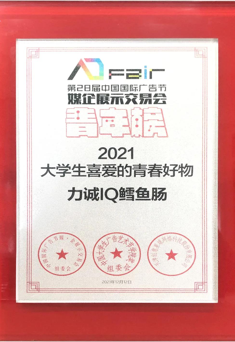 廣告節(jié)青年榜是一個從年輕人角度出發(fā),記錄、考評青春活力的獎項。 力誠通過加強與當(dāng)代青年的聯(lián)系,緊跟時代的步伐,成功占據(jù)當(dāng)代青年心中的重要地位,深受當(dāng)代年輕人的喜愛。 在12月12日的青春盛典上,力誠榮獲本屆青年榜中“2021大學(xué)生喜愛的活力品牌”;力誠IQ鱈魚腸榮獲“2021大學(xué)生喜愛的青春好物”。